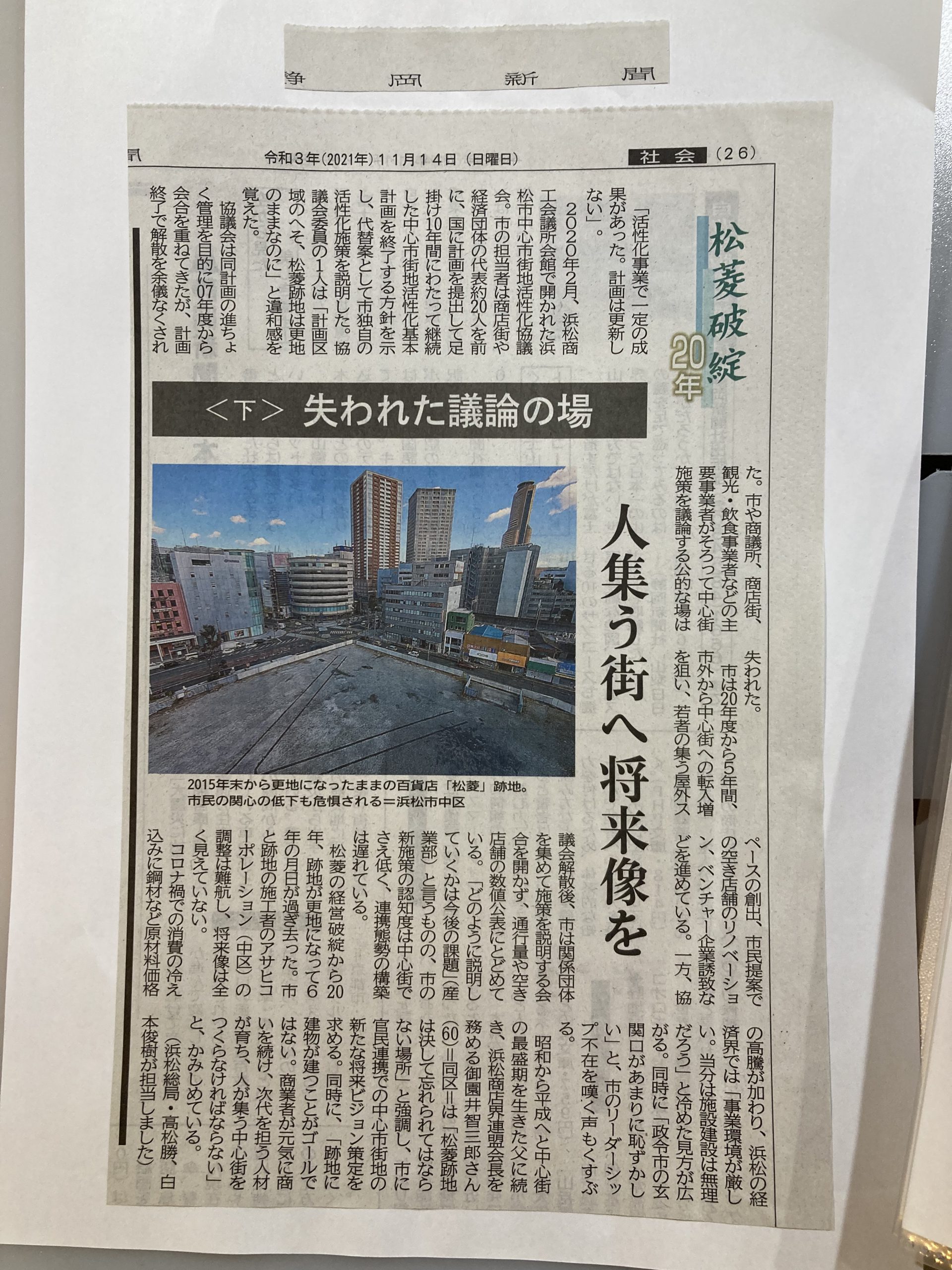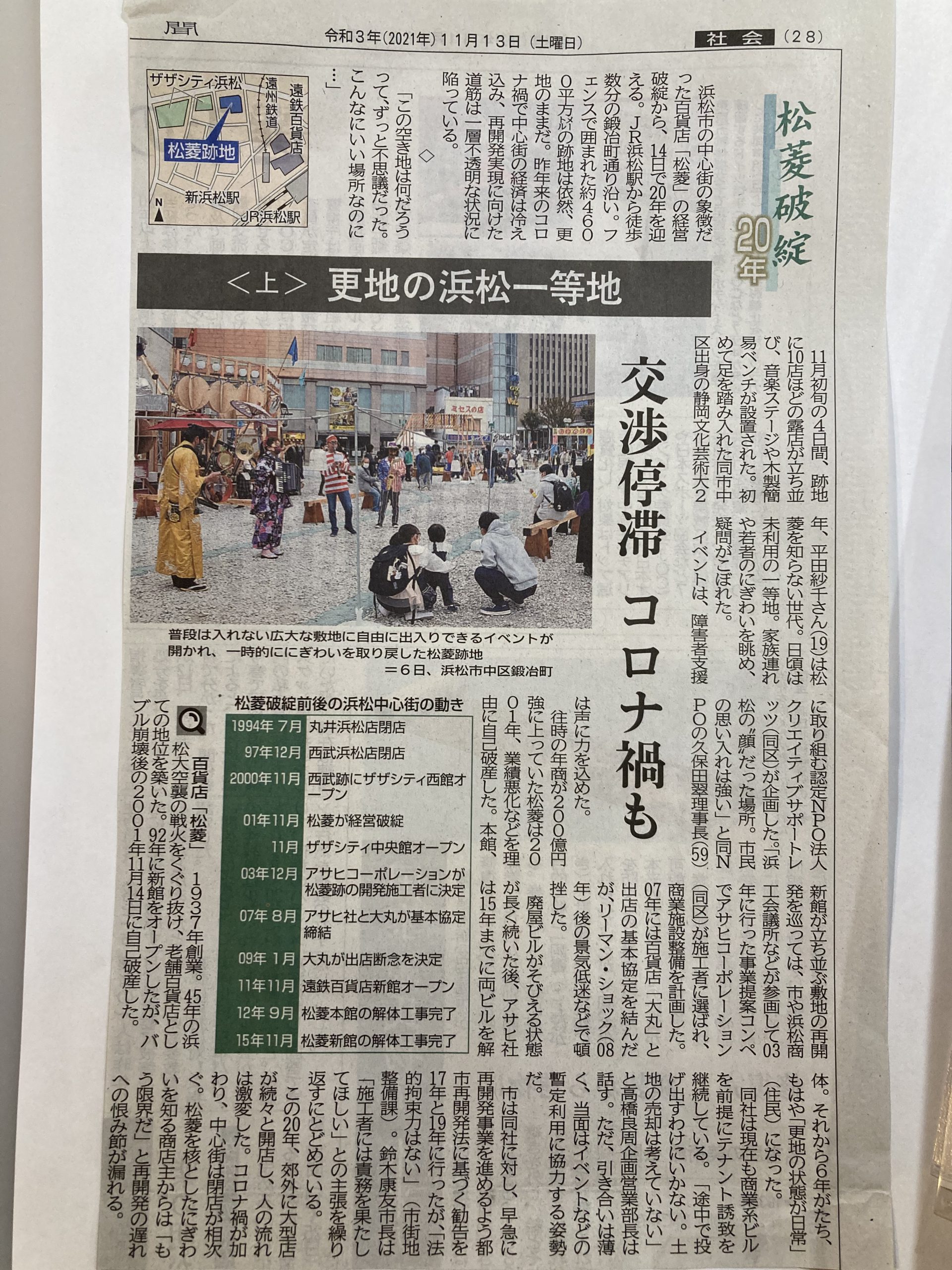 MEDIA 【日本経済新聞掲載】11/13・14 [松菱破綻20年(上・下)] 2021.12.18 日本経済新聞さんが2日間にわたって松菱跡地について掲載してくれました! 11月3日(水)〜11月7日(日)の期間で行われたアートプロジェクト「オン・ライン・クロスロード On-Line-Crossroad」を契機に街の活用の在り方に言及した記事となっています。